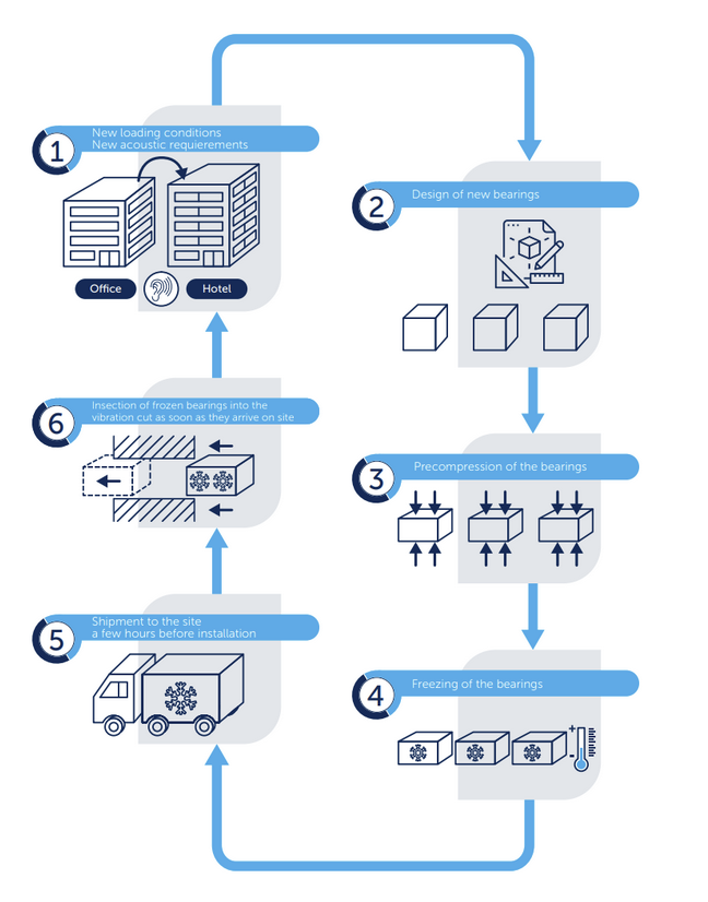 Prévu pour la rénovation : ajout ou amélioration de l’isolation vibratoire des bâtiments existants avec un impact structurel minimal.